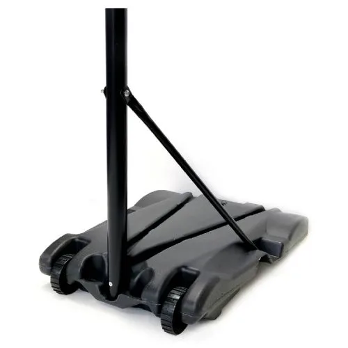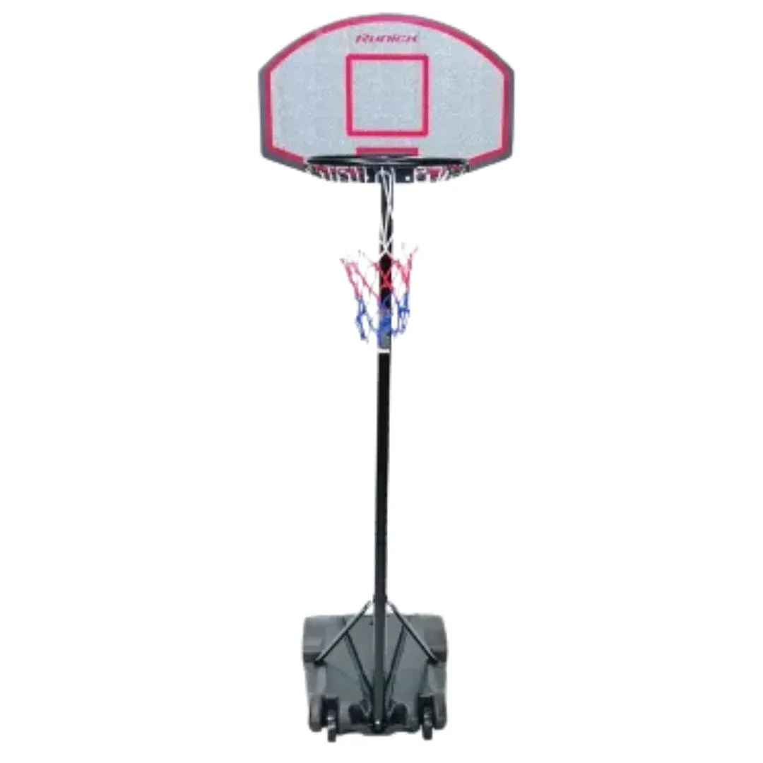 Su altura es regulable hasta 2,60 metros, cuenta con aro metálico de tamaño oficial de 45 cm con malla de poliéster tricolor, además cuenta con un tablero de PVC de 90 x 60 cm, todo esto soportado por una estructura metálica liviana de alta resistencia y una gran base de PVC rellenable con agua o arena húmeda para dar mayor estabilidad y muy fácil de mover gracias a sus ruedas .